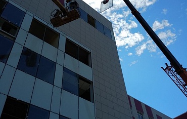 За два дня техникой АРЛИФТ был осуществлен монтаж стекла для телевизионных панелей в новом бизнес-центре «Невская Ратуша»