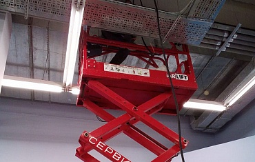 Ножничный подъемник с рабочей высотой до 7,8 метров смонтировал противопожарную сигнализацию в Новосибирске.
